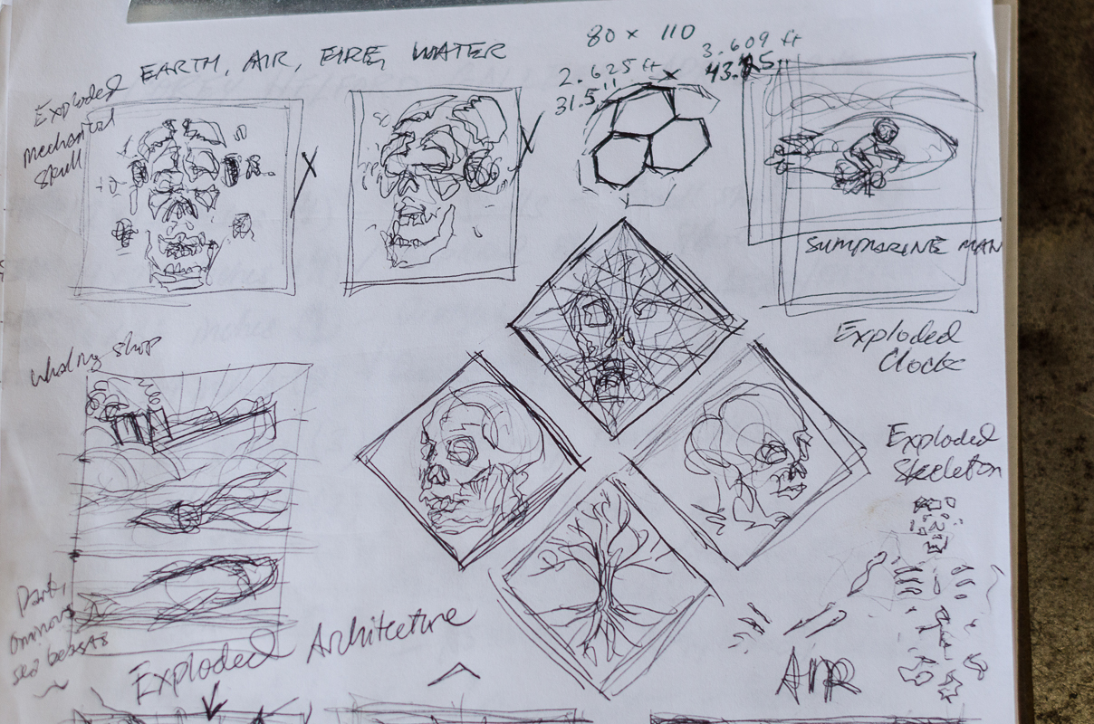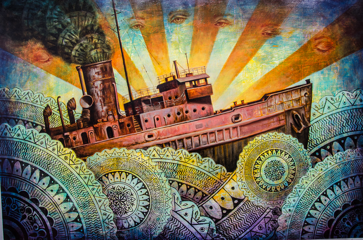 Beau Stanton is passionate about everything nautical, from ship construction, to old wrecks and their ornaments; he hunts nautical materials and artefacts on the shore (you may cross paths with him on Dead Horse Bay in Brooklyn) and antique shops which will inspire some of his works or will be used in his art, as for instance salvaged portholes inside of which he inserts an Ipad with one of his animated paintings. Scroll down to see these – you can also discover Beau’s Submariner animation built into the wall behind an old porthole in one of the 5th floor rooms of the trendy Wythe Hotel in Williamsburg, Brooklyn.