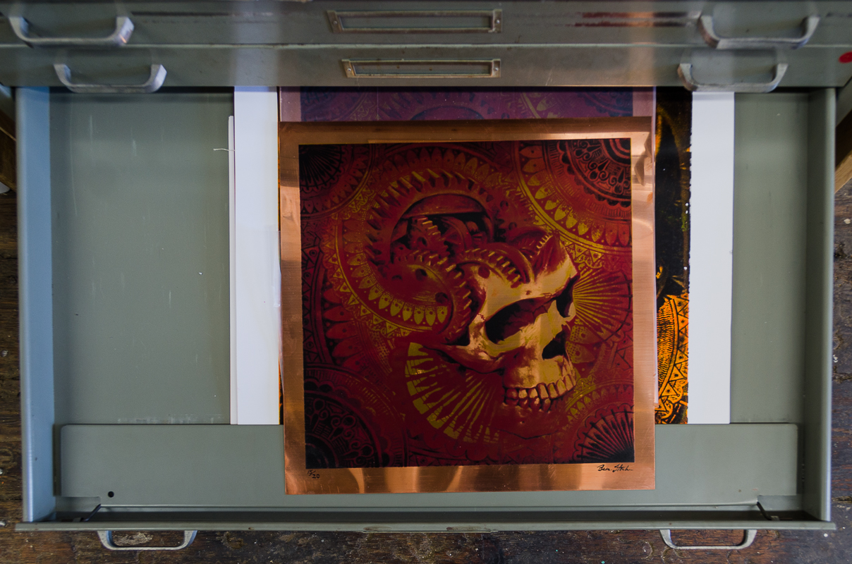 While I was with him, Beau Stanton made 10 hand screen prints of his piece Leviathan. Contrarily to other printing techniques, Beau uses a photographic emulsion to transfer the image onto the screen so that certain areas are left open or closed in the mesh for the ink to pass through in order to print the desired image. Screen printing is a very meticulous and lengthy process which involves adjusting, inking, layering, washing the screen and drying the prints at every step. The whole process is always an experiment with an uncertainty regarding the final colours of each print which depend on multiple factors such as the order of each layer, the quantity of ink and the weight applied to the ink with the squeegee on the screen. As a result, each print is unique, and Beau usually embellishes them one by one by hand. Fascinating! – Don’t hesitate to clic on the images to enlarge them and get the detailed explanation of the printing process.